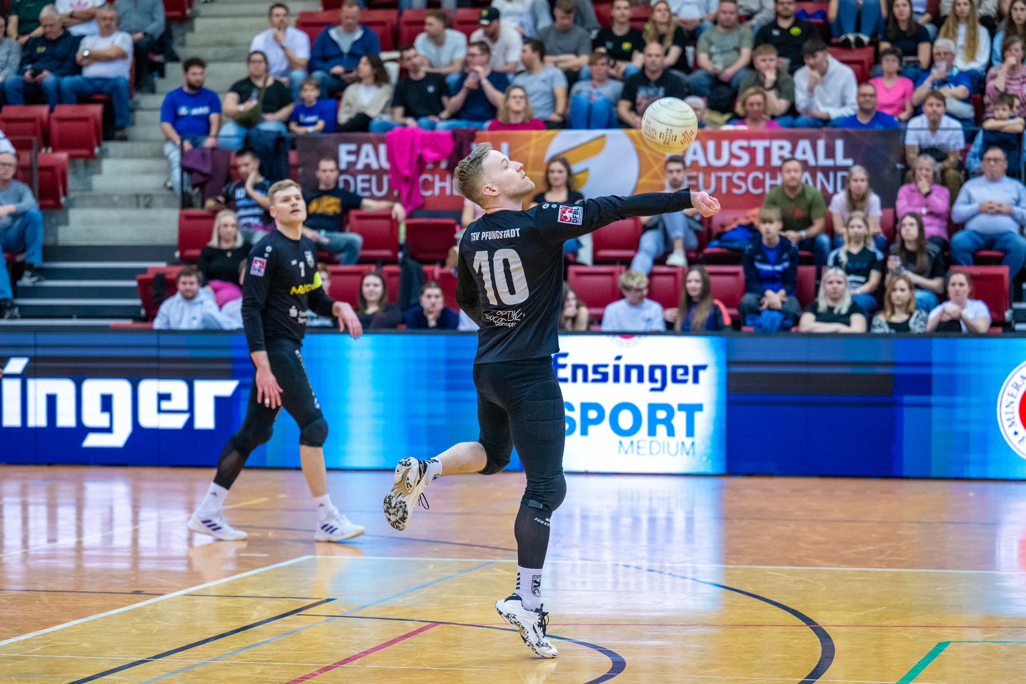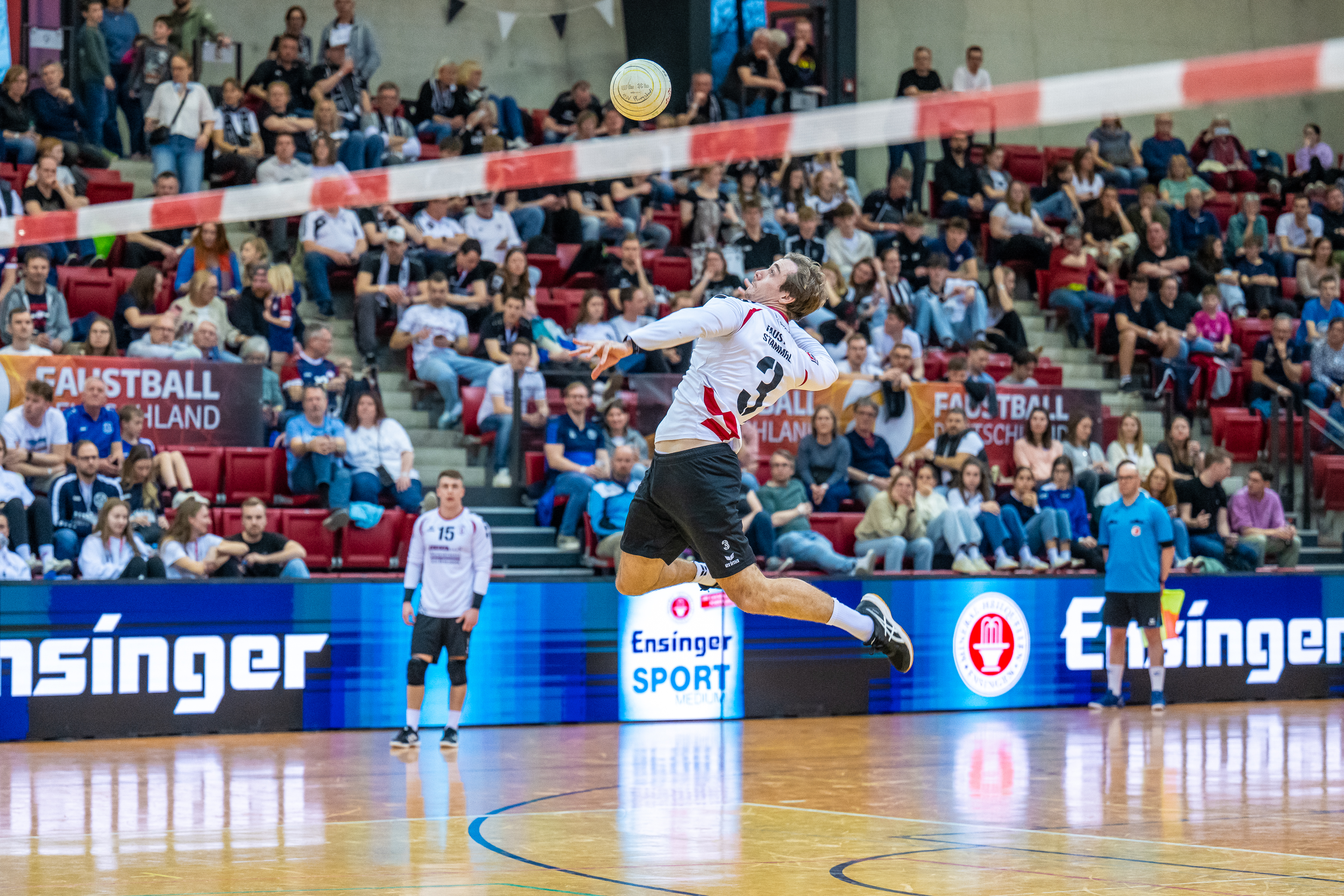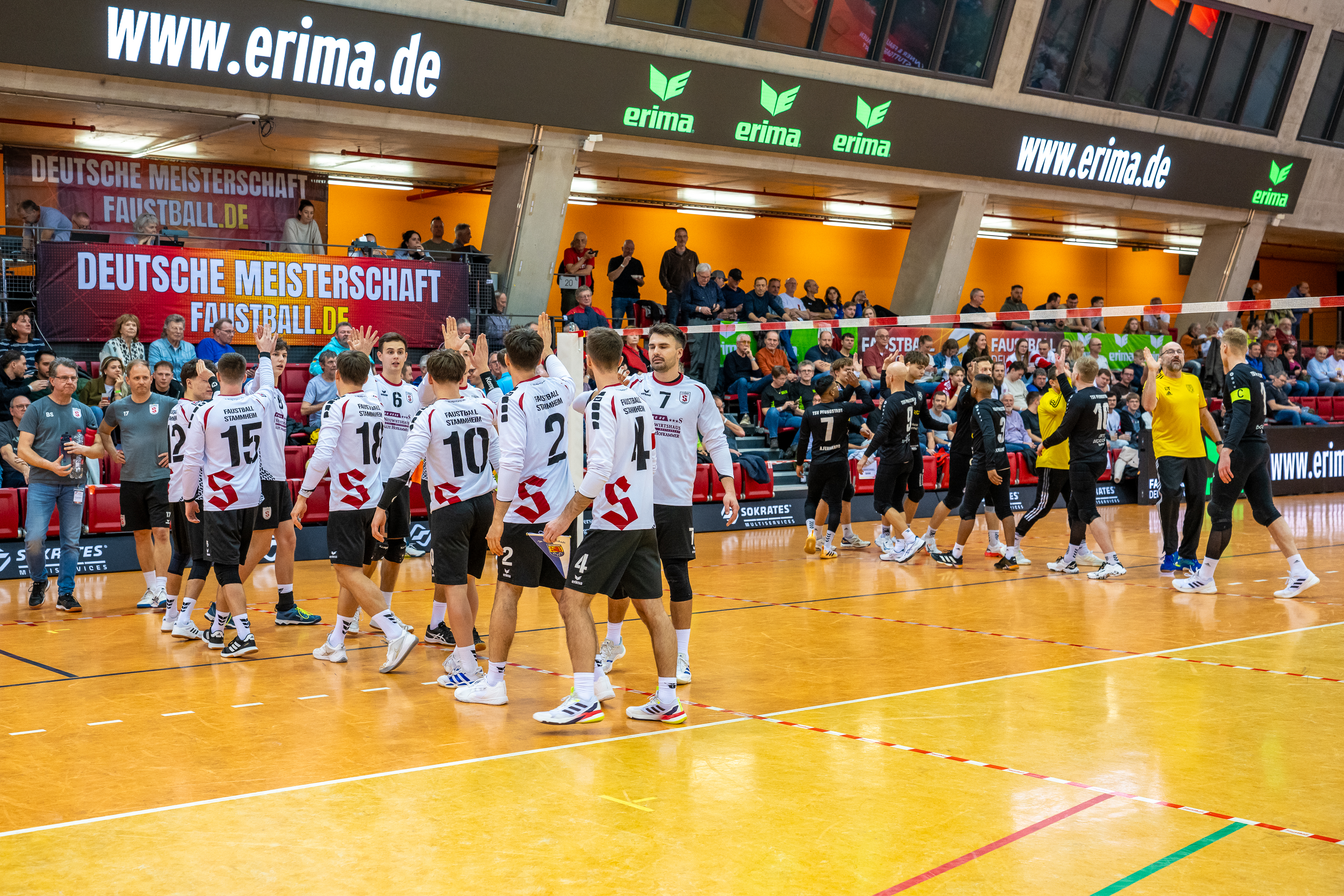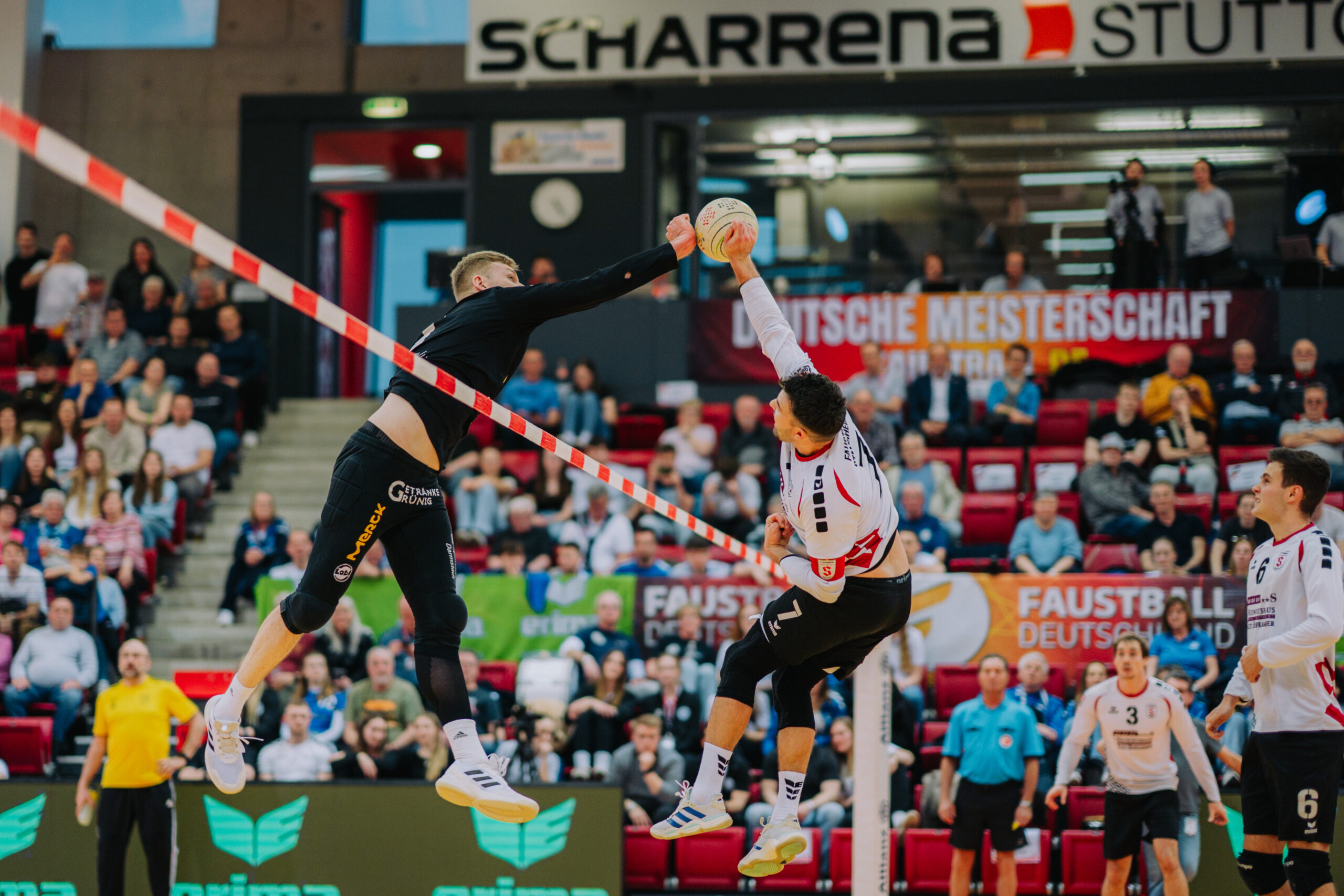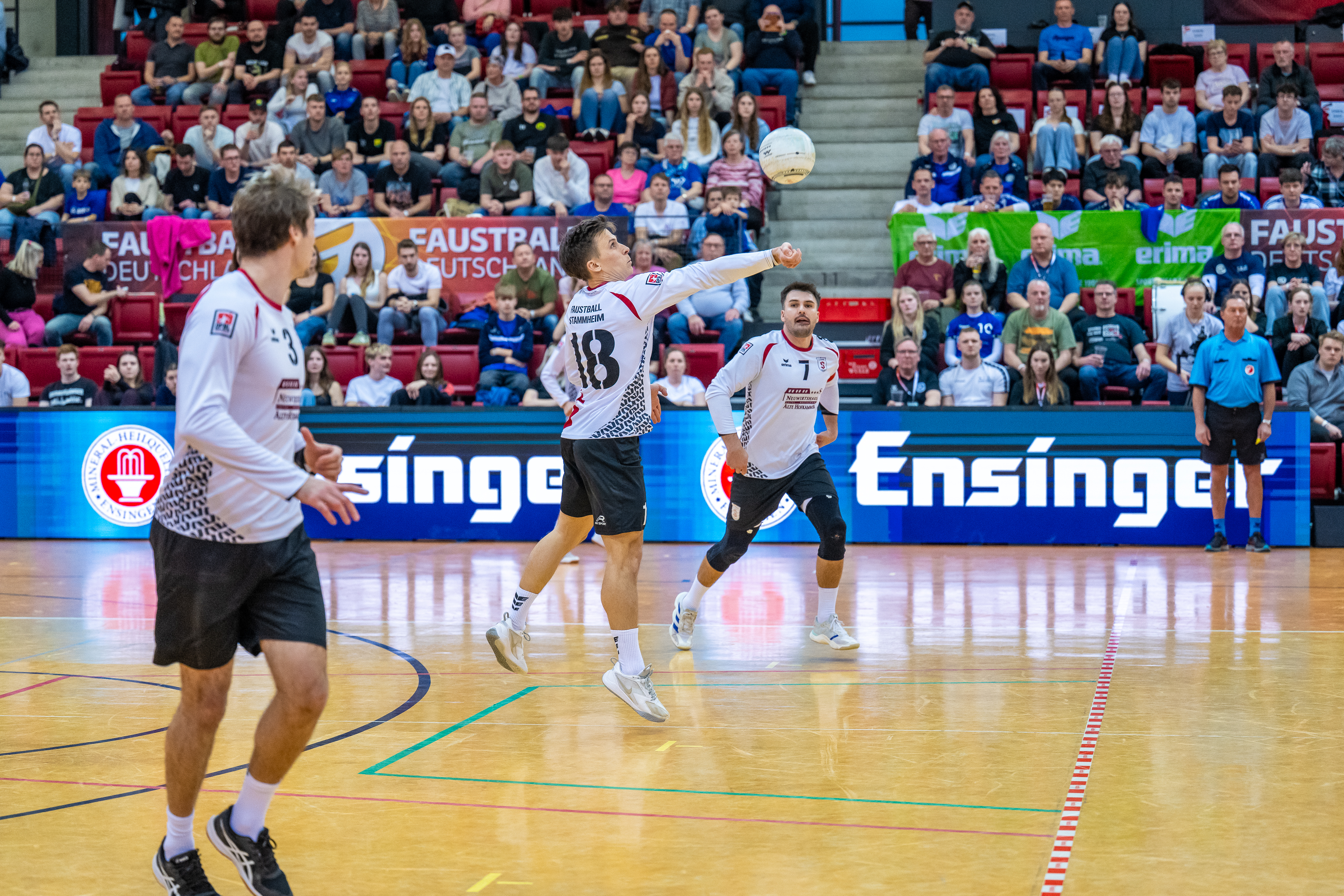 Mit großer Spannung war das Duell der Süd-Klubs erwartet worden. Der durch viele Spitzenturniere gestählte TSV Pfungstadt gegen Emporkömmling TV Stammheim, der sich in diesem Winter mit zwei Weltklasse-Brasilianern verstärkte. Und die standen beide in der Startaufstellung: Gabriel Heck (Hauptschlag) und Gabriel Drumm (Zuspiel). Doch der Herausforderer, angefeuert von einem lautstarken Fan-Block, hatte gegen stark motiviert auftretende Pfungstädter um Patrick Thomas anfangs gar nichts zu melden. Der herausragende Faustballer der letzten Jahre zeigte sein Können, sprang an der Leine in eine andere Atmosphäre und setzte Preller um Preller. Bääähm! – 11:3, 11:3.