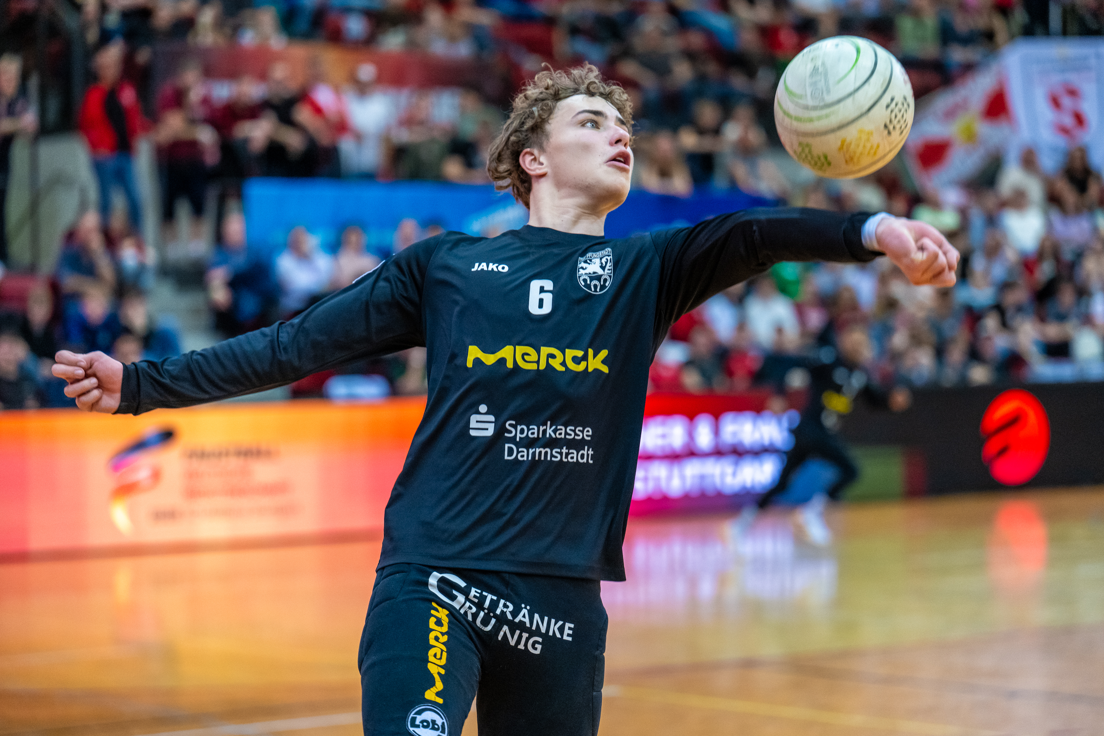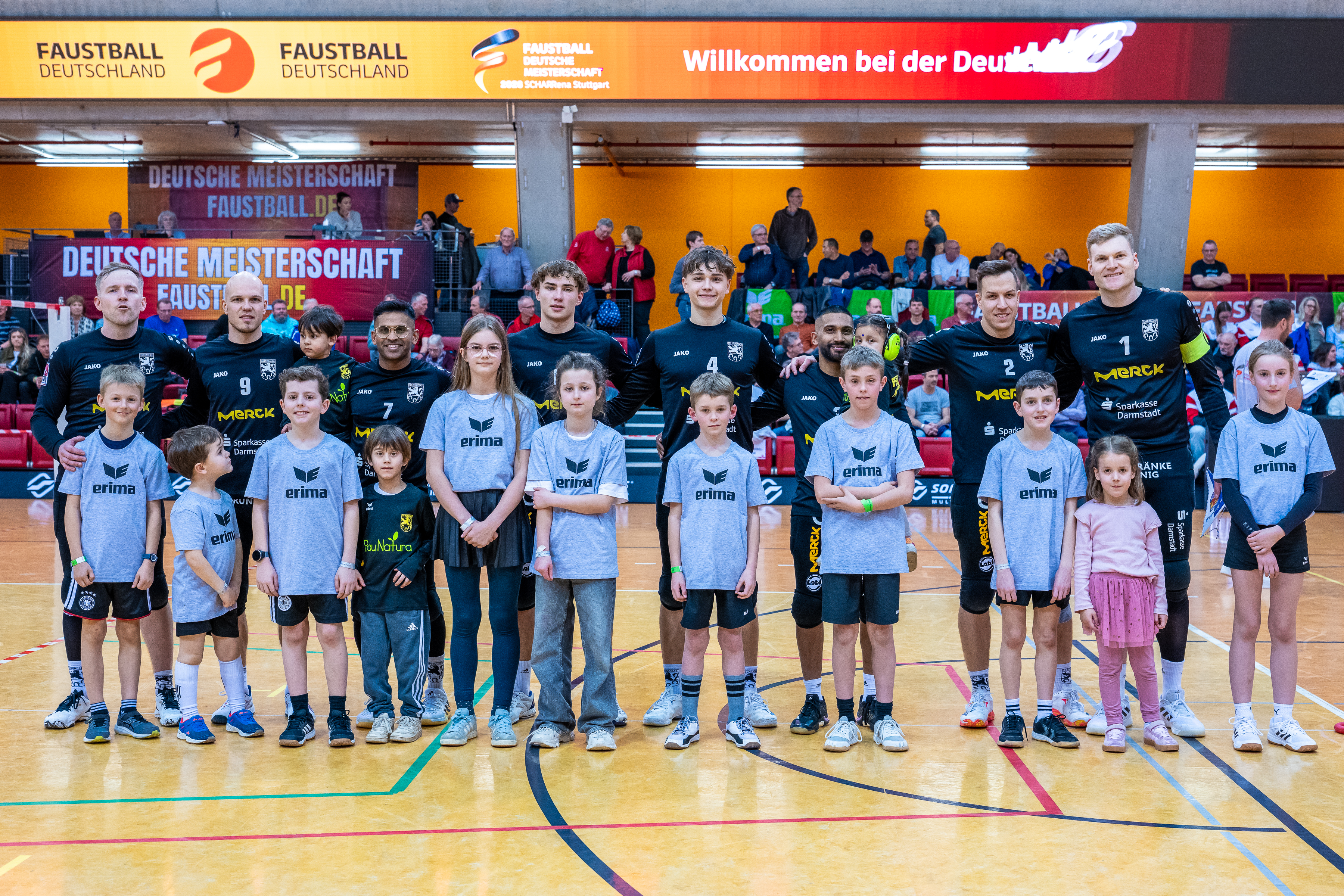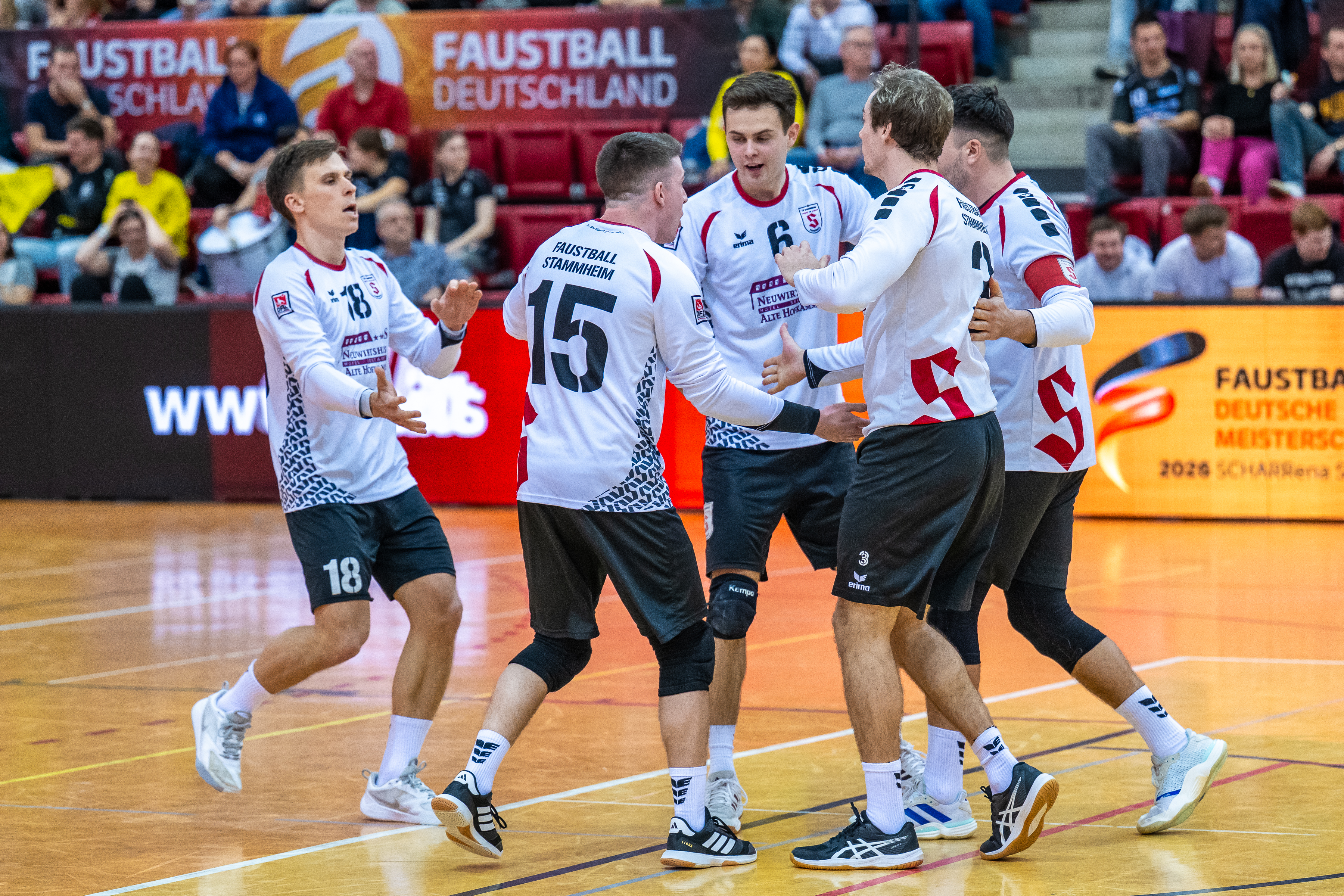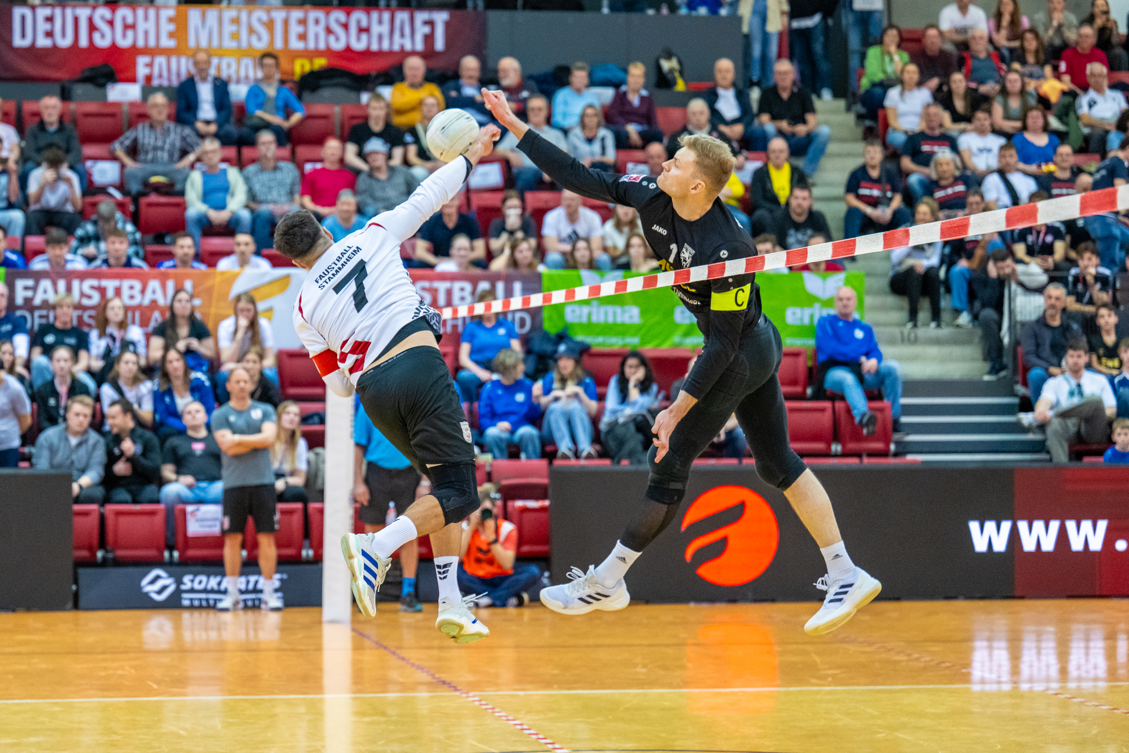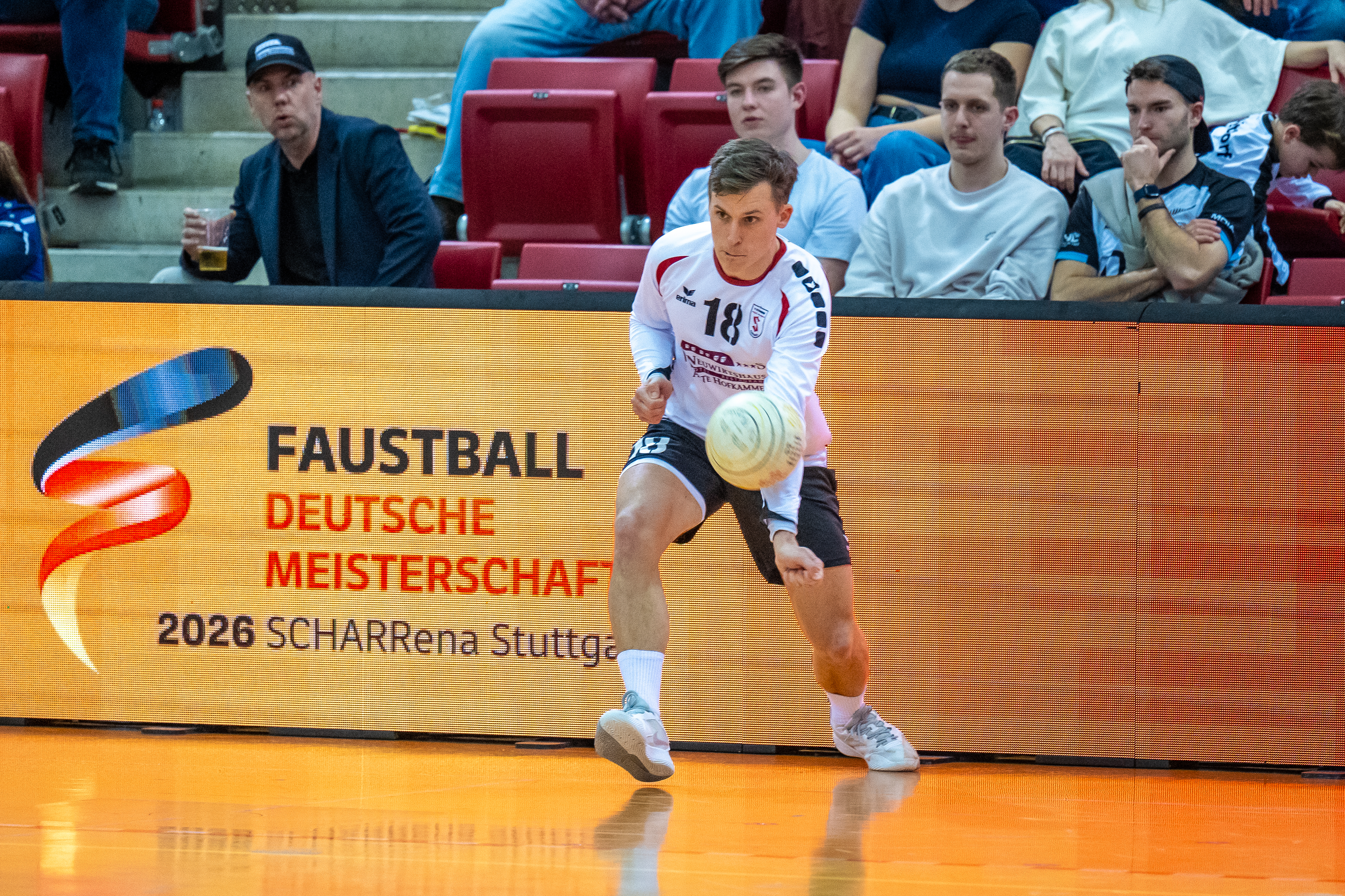 Mit großer Spannung war das Duell der Süd-Klubs erwartet worden. Der durch viele Spitzenturniere gestählte TSV Pfungstadt gegen Emporkömmling TV Stammheim, der sich in diesem Winter mit zwei Weltklasse-Brasilianern verstärkte. Und die standen beide in der Startaufstellung: Gabriel Heck (Hauptschlag) und Gabriel Drumm (Zuspiel). Doch der Herausforderer, angefeuert von einem lautstarken Fan-Block, hatte gegen stark motiviert auftretende Pfungstädter um Patrick Thomas anfangs gar nichts zu melden. Der herausragende Faustballer der letzten Jahre zeigte sein Können, sprang an der Leine in eine andere Atmosphäre und setzte Preller um Preller. Bääähm! – 11:3, 11:3.