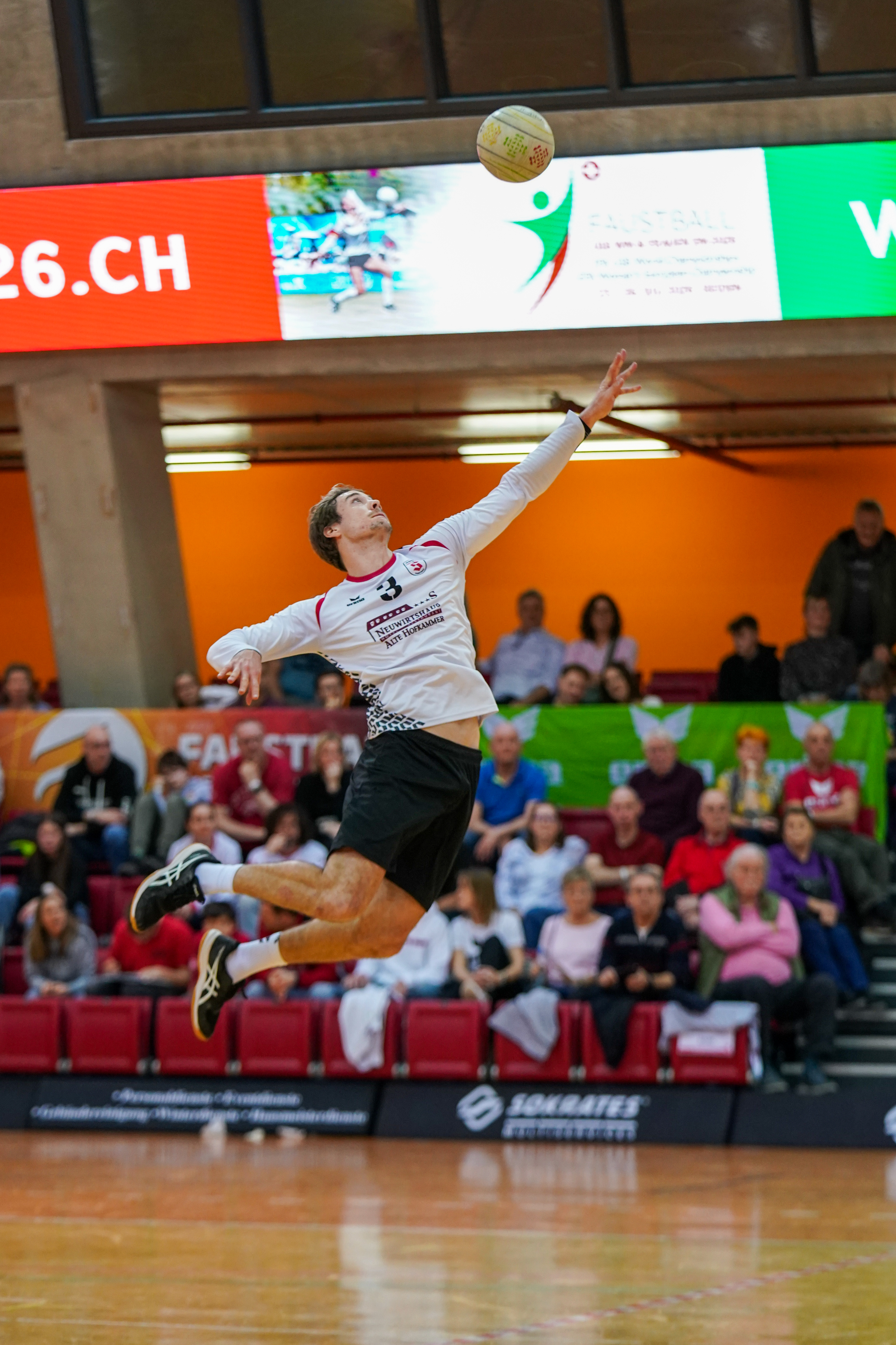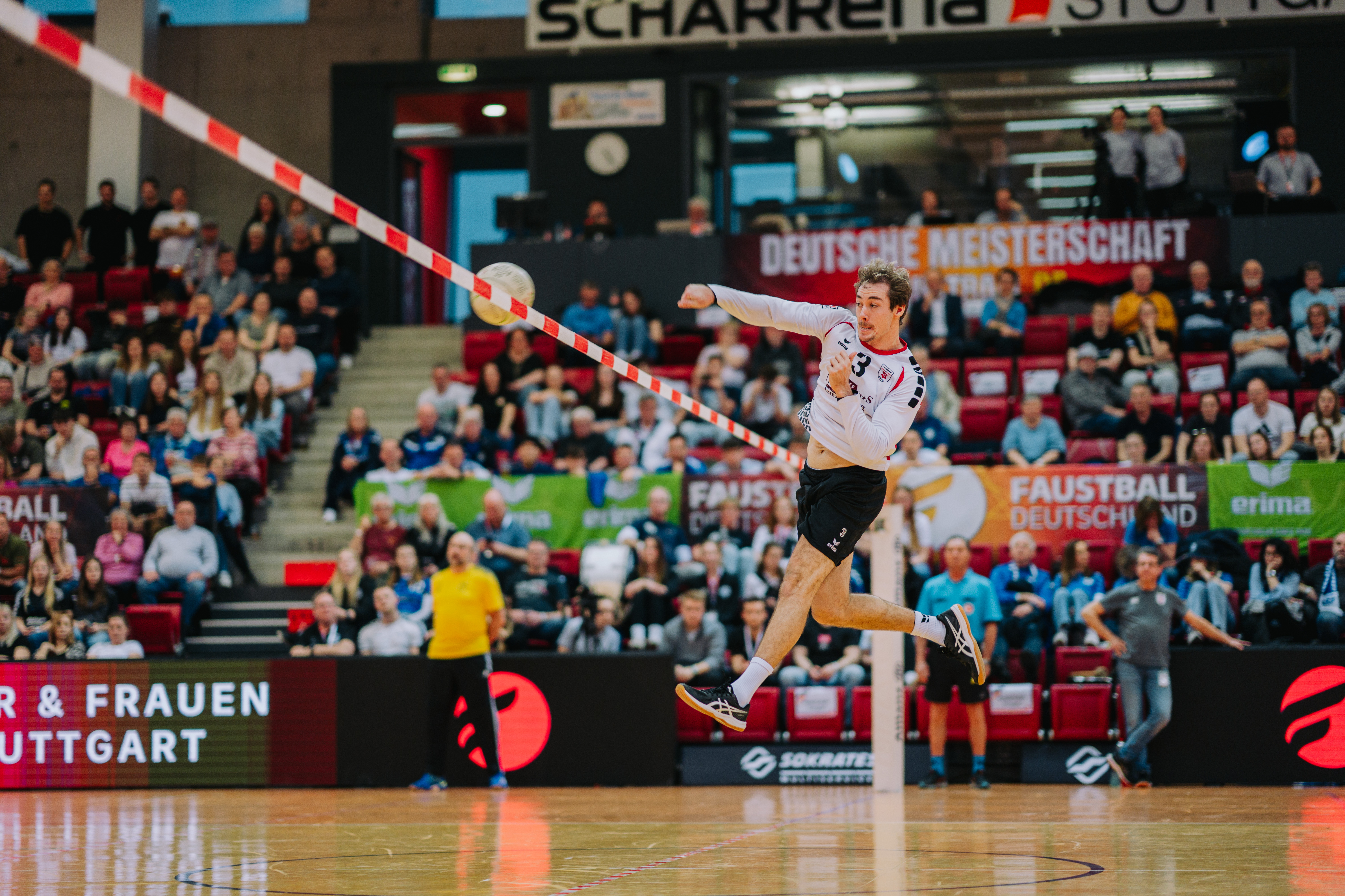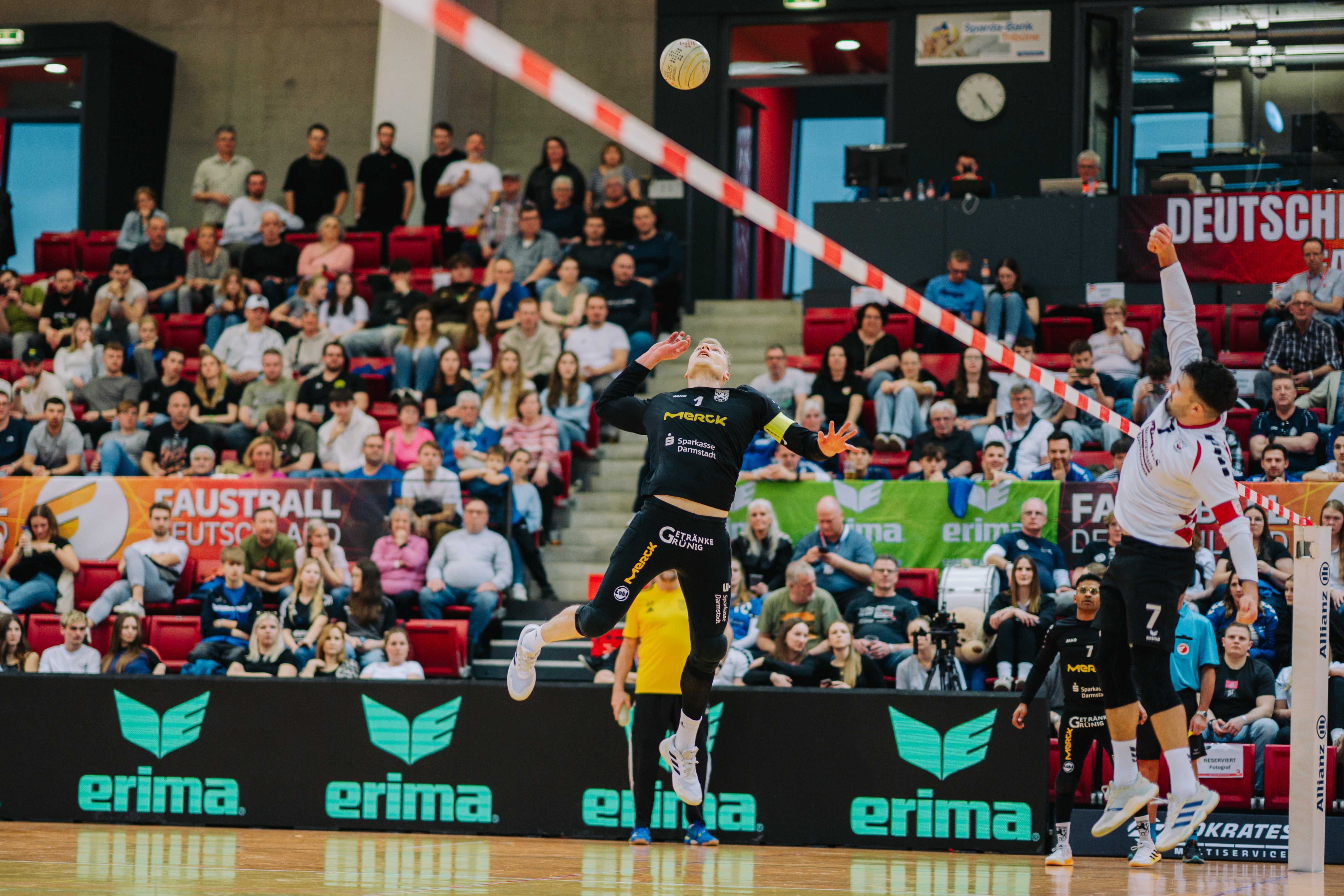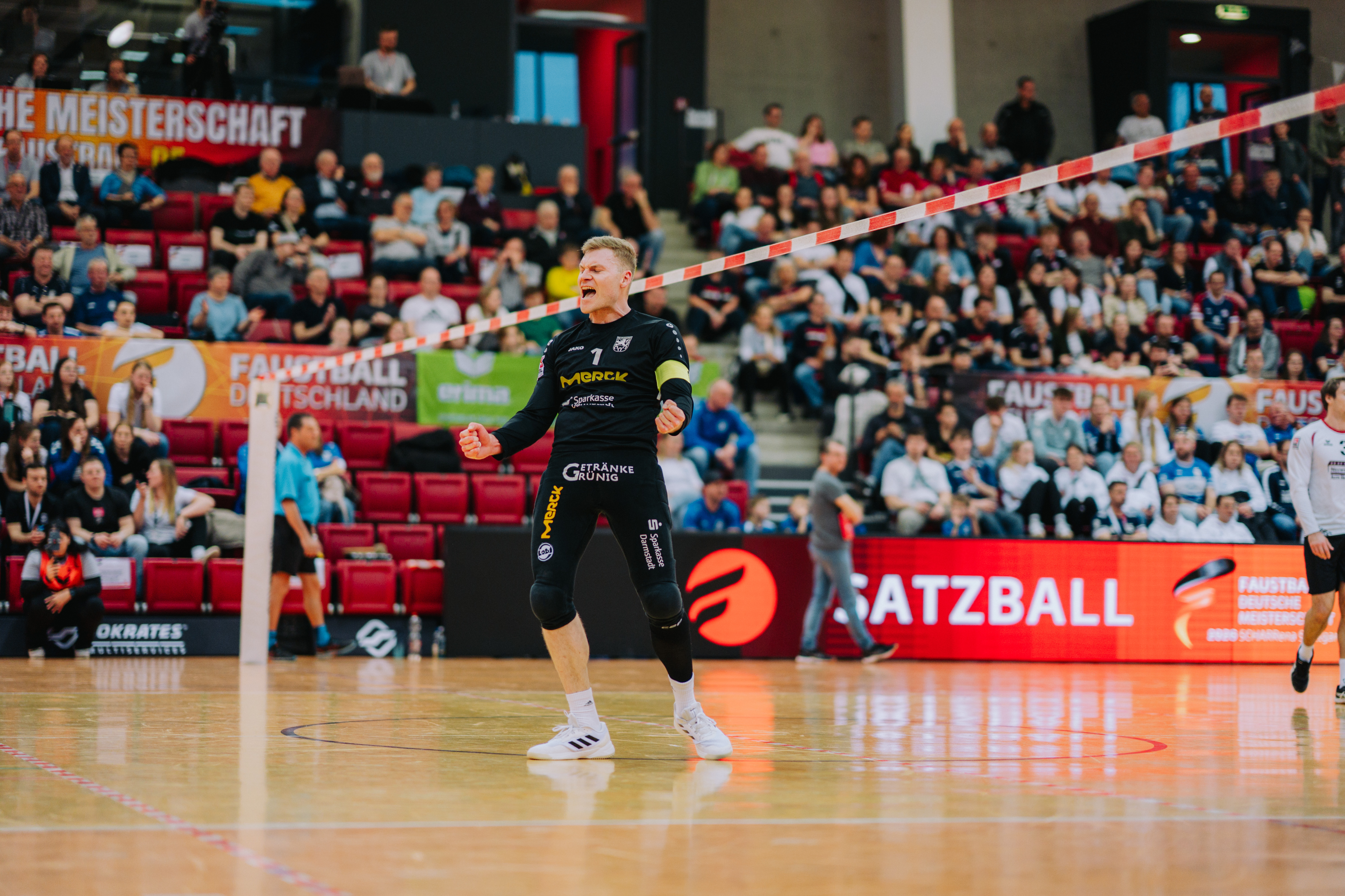 Mit großer Spannung war das Duell der Süd-Klubs erwartet worden. Der durch viele Spitzenturniere gestählte TSV Pfungstadt gegen Emporkömmling TV Stammheim, der sich in diesem Winter mit zwei Weltklasse-Brasilianern verstärkte. Und die standen beide in der Startaufstellung: Gabriel Heck (Hauptschlag) und Gabriel Drumm (Zuspiel). Doch der Herausforderer, angefeuert von einem lautstarken Fan-Block, hatte gegen stark motiviert auftretende Pfungstädter um Patrick Thomas anfangs gar nichts zu melden. Der herausragende Faustballer der letzten Jahre zeigte sein Können, sprang an der Leine in eine andere Atmosphäre und setzte Preller um Preller. Bääähm! – 11:3, 11:3.