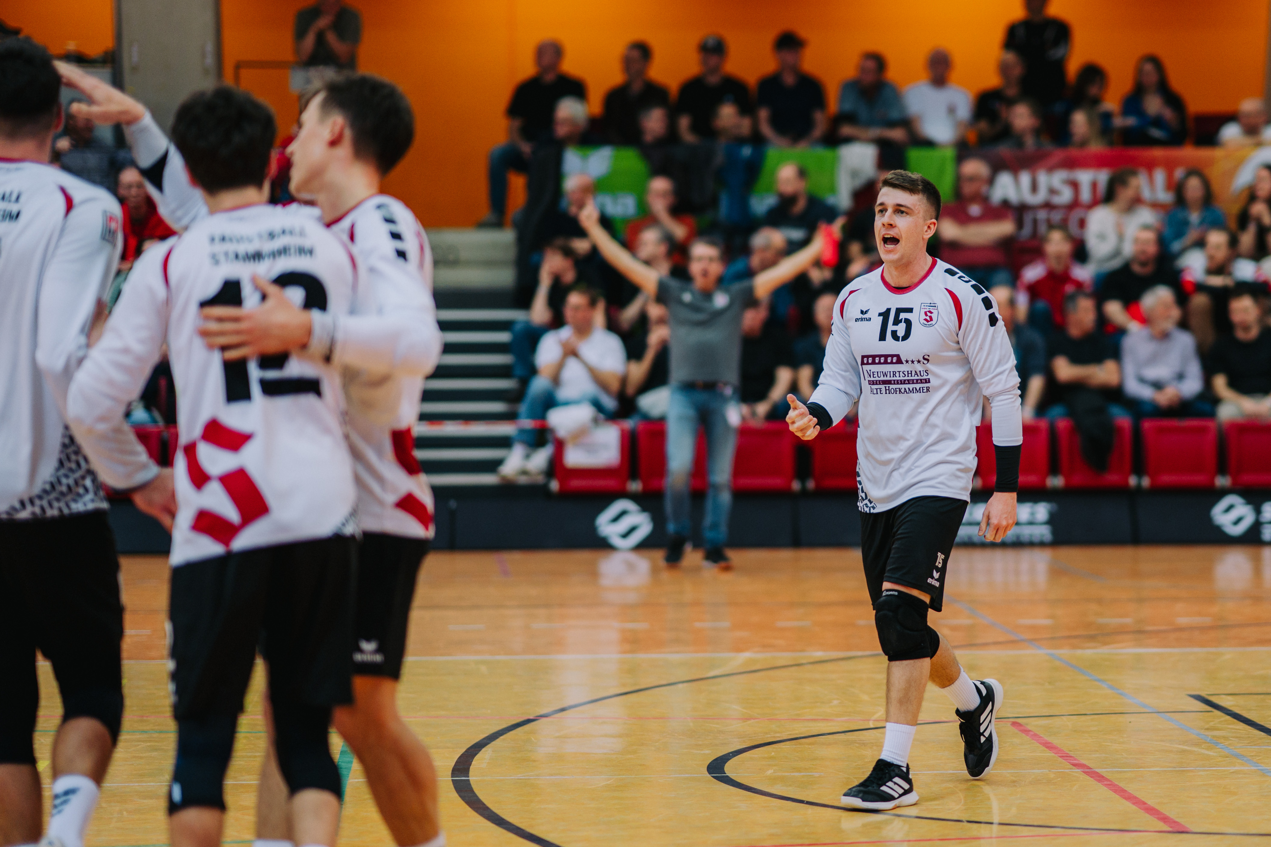 Andersherum lief es nach der 10-Minuten-Pause: Pfungstadt führte 7:2, bei Stammheim kam Heck für Gayer zurück ins Spiel – und Erlenmayer, der später verdient zum Player of the Match gekürt wurde, drehte auf. Bis 9:8 kam sein Team heran, dann schnürte Patrick Thomas den Sack zu. Auch nach mehreren Wechseln in der Abwehr blieb Stammheim ein gefährlicher Gegner für den Favoriten. Nach spektakulären Ballwechseln in einer hitziger werdenden Atmosphäre setzte sich die Klasse der Pfungstädter aber erneut durch. Der sechste und letzte Satz war ein Schaulaufen des Titelverteidigers. Kurz nach der 9:0-Führung aber zog sich Dennis Gruber, der bis dahin einen starken Assistenten am Zweitschlag abgab, eine Zerrung zu und konnte noch zusehen, wie seine Mannschaft mit dem noch schnell eingewechselten Andrew Fernando das Spiel locker ins Ziel schaukelte. Ob Gruber am Sonntag das Endspiel gegen TV 1880 Käfertal bestreiten kann, stand kurz nach dem Spiel noch in den Sternen.